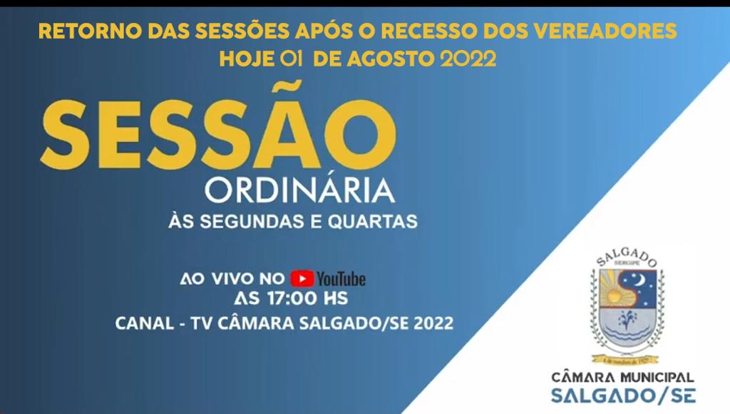 Após o recesso parlamentar, a Câmara Municipal de Salgado volta a realizar as atividades legislativas, nesta segunda-feira (01) de Agosto. A 1ª Sessão Ordinária do segundo semestre de 2022 acontece a partir das 17:00hs.